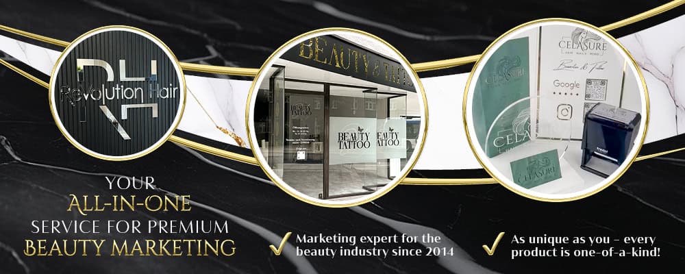 With Beauty-Marketing-Expert by your side, you can make your dream of advertising that truly fits you come true. Our products are as high-quality and refined as your work — you won’t find any ordinary, off-the-shelf items here. We put as much passion into our creations as you do into your craft! We offer marketing materials ranging from the creation of your bonus card and appointment cards to business cards, flyers, and complete studio designs — both inside and out.