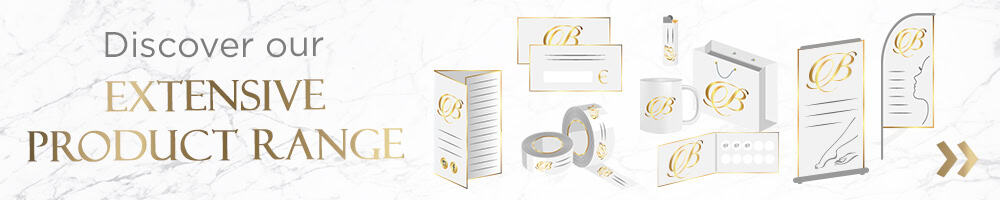 Business cards, appointment cards, bonus cards, flyers, price lists, vouchers, certificates, stamps, websites, clothing, signs, lettering, and complete studio designs — want your logo on different products? That’s no problem for us at Beauty Marketing Expert!