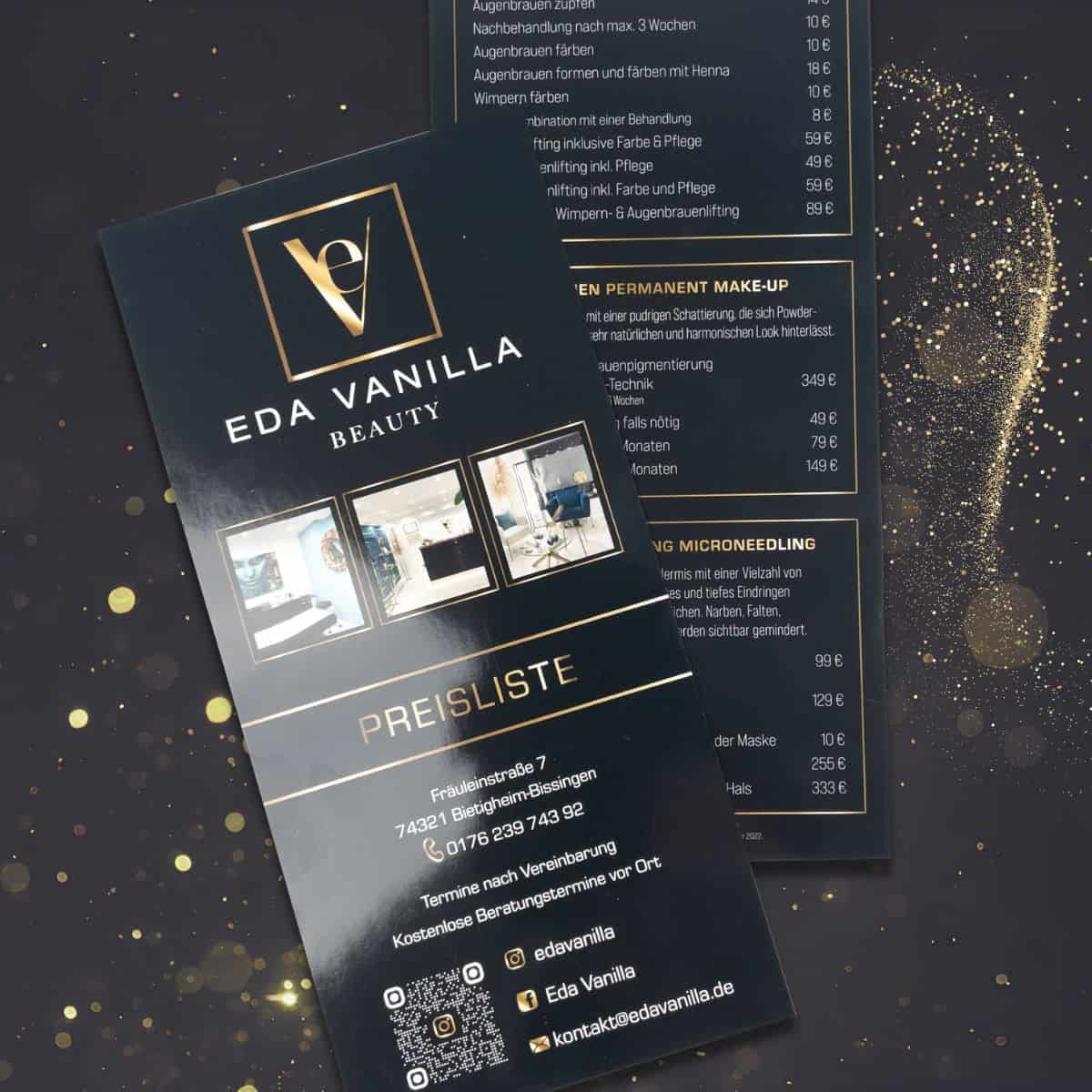 Hand out this exclusive flyer with a liquid gold or liquid silver finish to potential new customers and make them happy with this elegant handout. Whether it’s a flyer for cosmetics, your PMU treatments, pedicures, teeth whitening or other beauty treatments, your customers will be immediately impressed by the individual design and first-class quality.