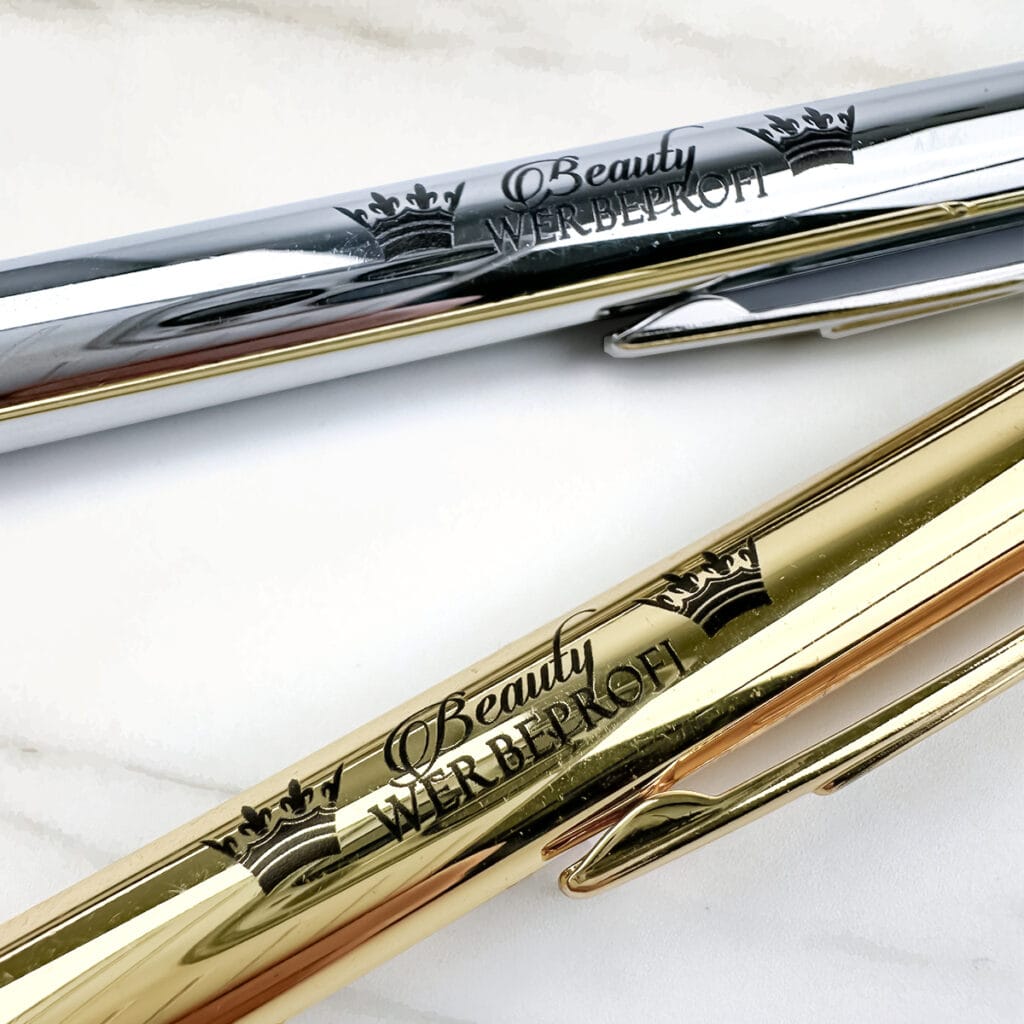 Did you know that ballpoint pens are still one of the most popular promotional items? And we have chosen a really chic model especially for beauty studios: high-quality metal ballpoint pens – Golden Pen and Silver Pen – which we print with your logo.