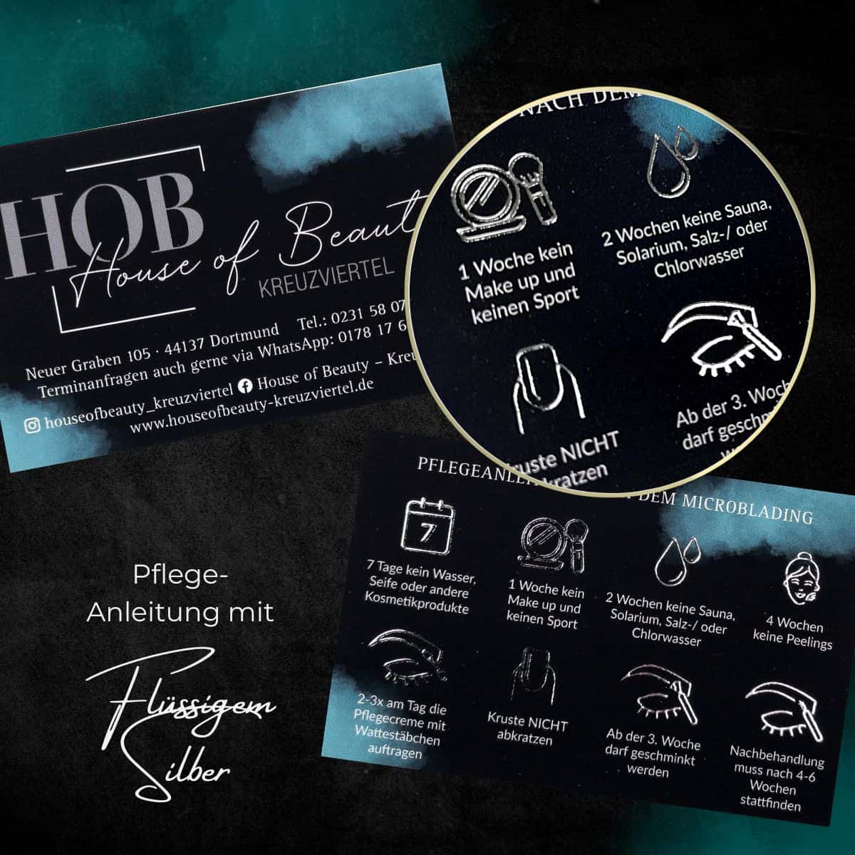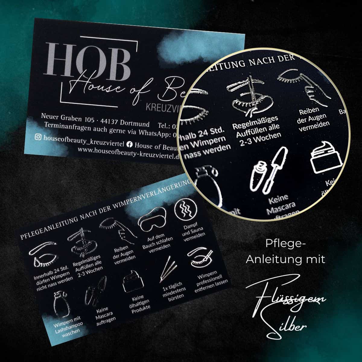 This business card, finished with liquid gold or silver, not only looks glamorous, you can even feel the exclusivity of these care instructions after successful eyelash extensions thanks to the soft-touch surface.