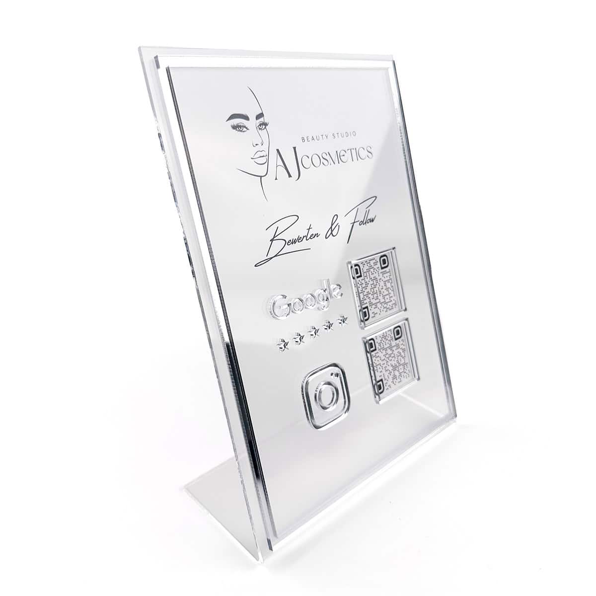 Counter price list / information display individually designed for you. Finally you can present your package offers, opening hours, information about voucher sales or a price list at eye level on your reception counter. Made in Germany, of course. So you can conveniently buy directly from us in Germany. And if you want, we can also provide you with the right social media display !