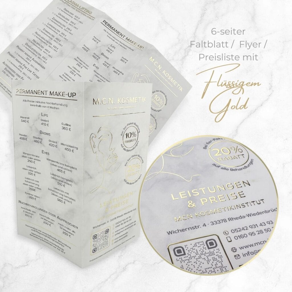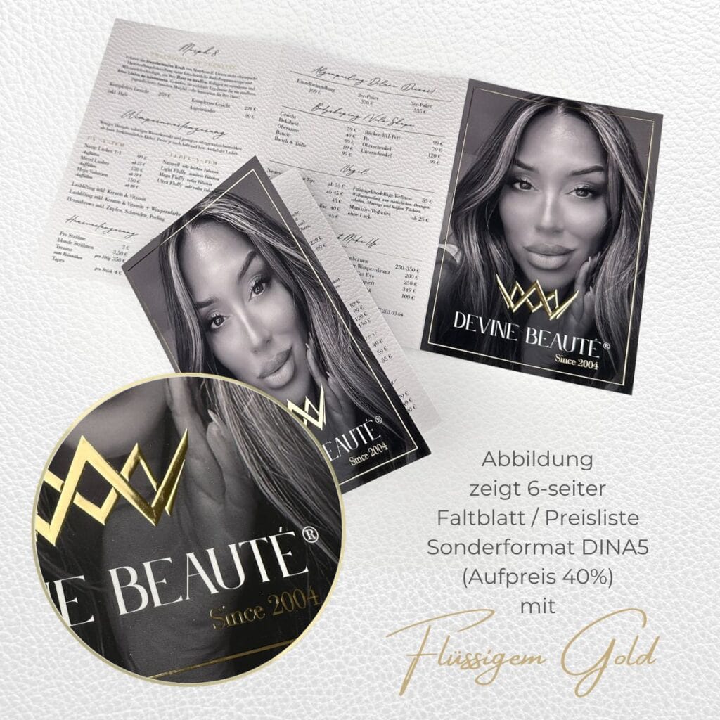 Give potential new customers this exclusive leaflet with a liquid gold or liquid silver finish and make them happy with this elegant handout. Whether it’s a 6-page flyer for cosmetics, your PMU treatments, pedicures, teeth whitening or other beauty treatments, your customers will be immediately impressed by the individual design and first-class quality.