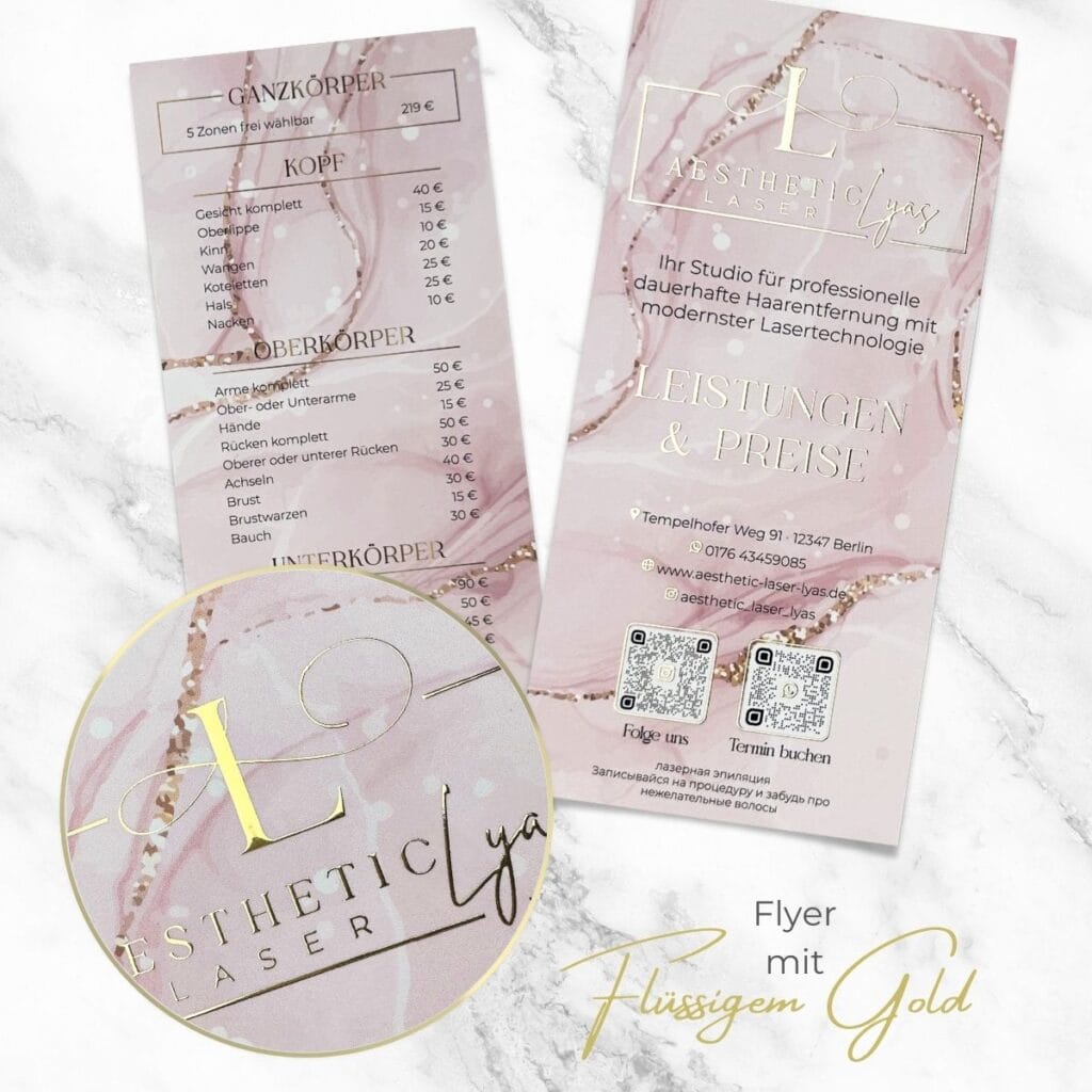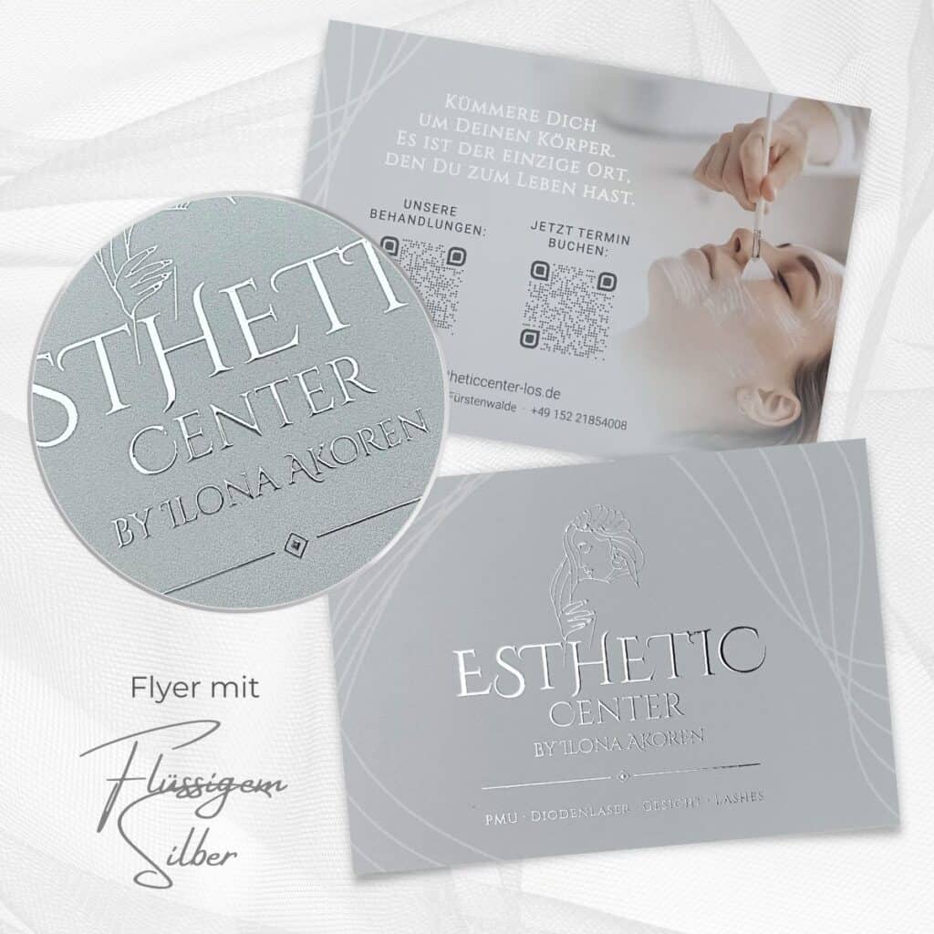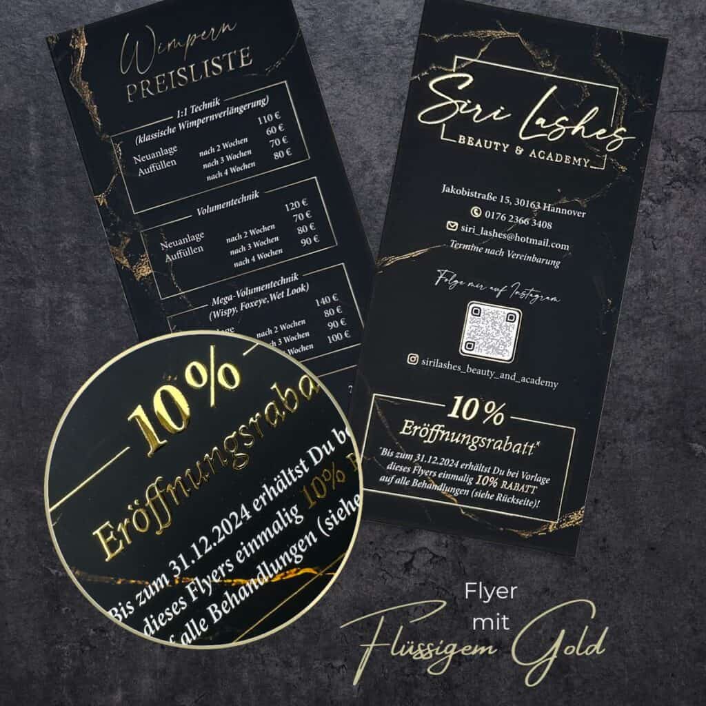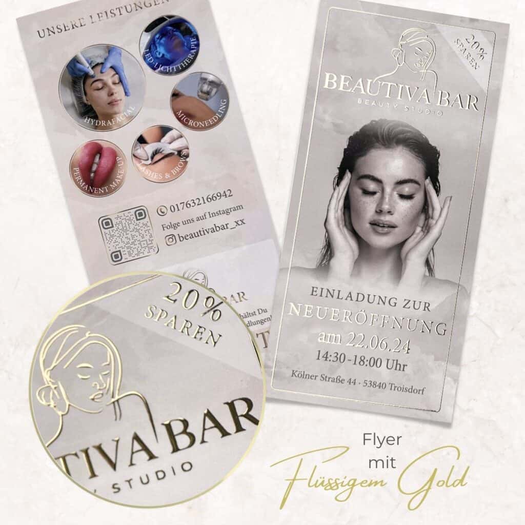 Hand out this exclusive flyer with a liquid gold or liquid silver finish to potential new customers and make them happy with this elegant handout. Whether it’s a flyer for cosmetics, your PMU treatments, pedicures, teeth whitening or other beauty treatments, your customers will be immediately impressed by the individual design and first-class quality.