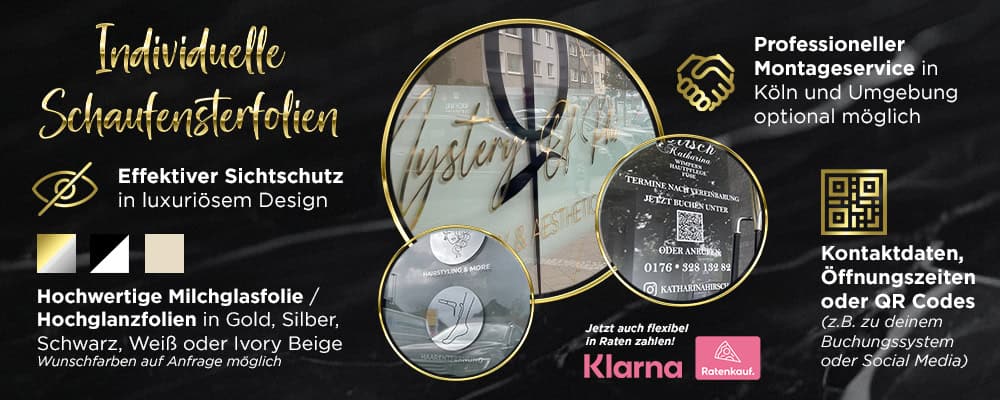 After receiving your prepayment (we also offer payment by installments via Klarna), we will create a first draft for your individual and luxurious shop window signage! After approval, we will deliver the high-quality, ready-to-apply film for you to install yourself*, so there are no installation costs. If you are unsure, we also offer optional on-site installation within a radius of approx. 180 km around Lohmar. As you can see, we stand by your side, are there for you and try to make all your wishes come true.